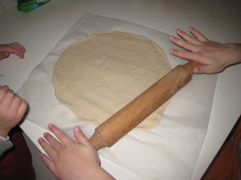 מרדדים את כדורי הבצק על גבי נייר אפיה