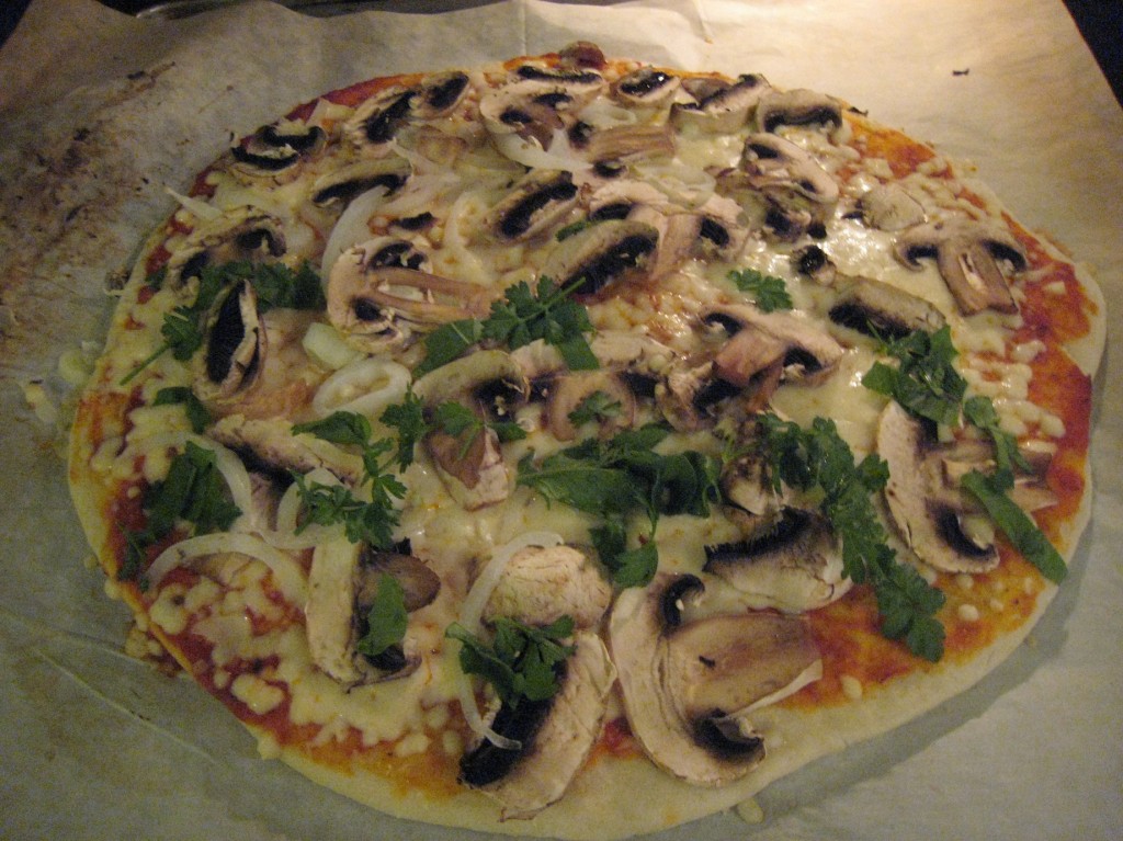 הוא פיצה עם פטריות, רצועות בצל סגול ועלי פטרוזיליה.
