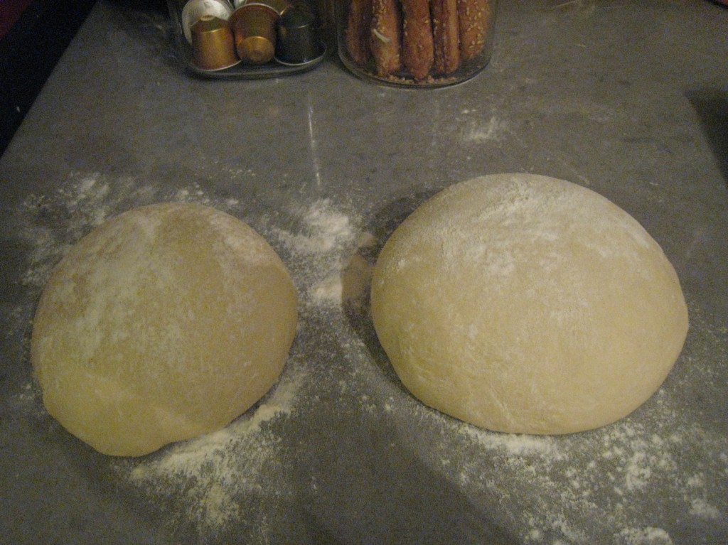 לחלק את הבצק לשני כדורים ולהניח אותם להתפחה על השיש או בקערה למשך חצי שעה.